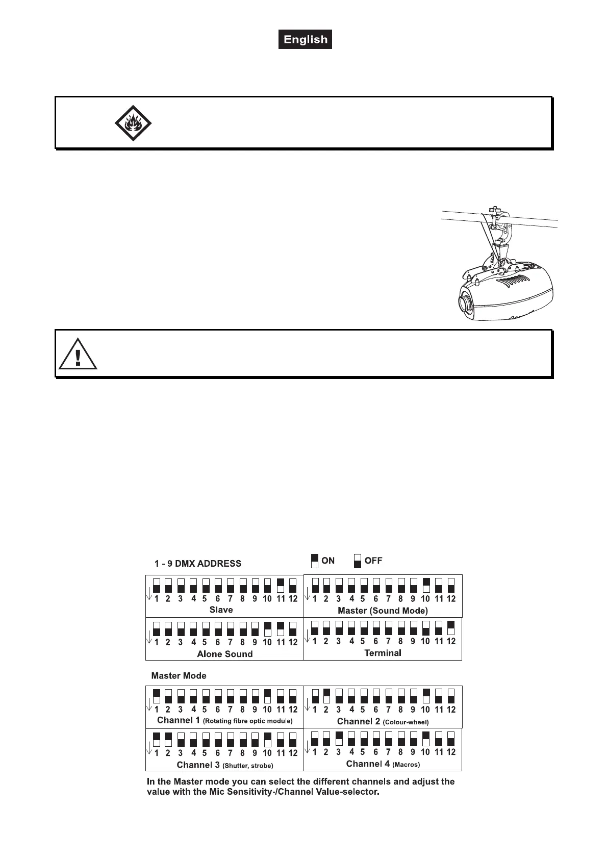 For overhead use, always install a safety-rope that can hold at least 12 times the weight of the fixture. You