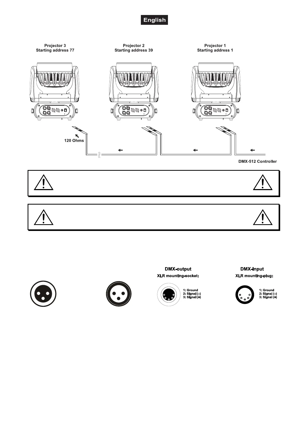 Only use a DMX-cable and 3-pin or 5-pin XLR-plugs and connectors in order to connect the controller with