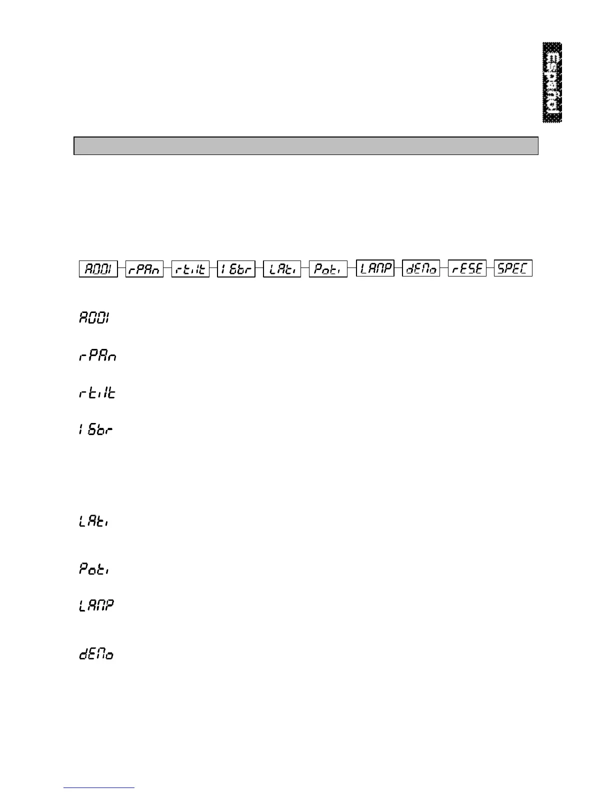En la pantalla aparece: A001, rPAn, rTilt, 16br, Lati, Poti, LAMP, dEMo, rESE, SPEC