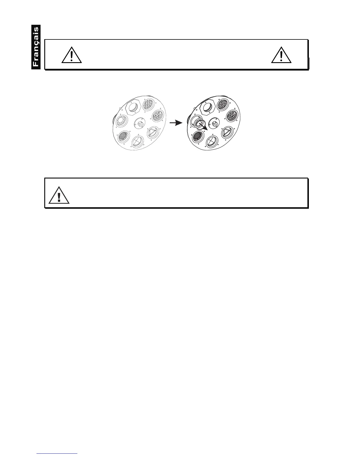 Rémovez l'anneau de fixation avec un outil approprié. Rétirez le gobo et insérez le nouveau gobo. Pressez