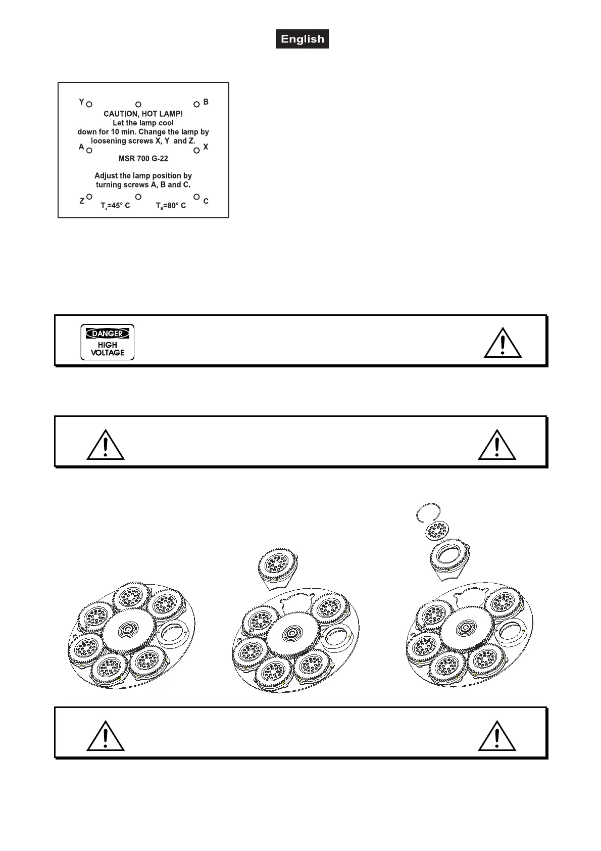 in the reflector. "Push” the lamp out by turning the screws "A, B, C” counterclockwise ¼-turn at a time the