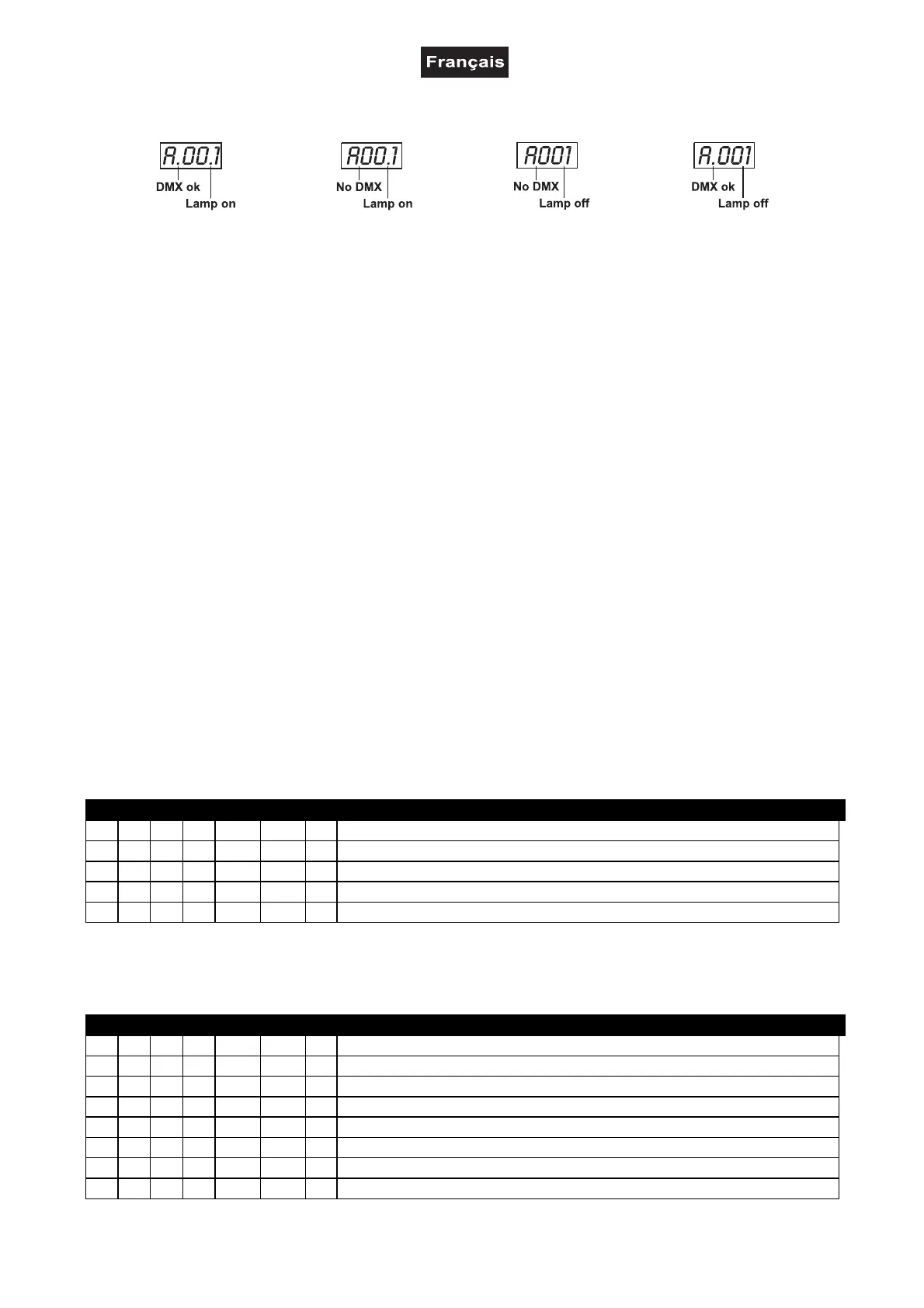 L'appareil indique les modes des signaux DMX-512 et de la lampe grâce à l'affichage: