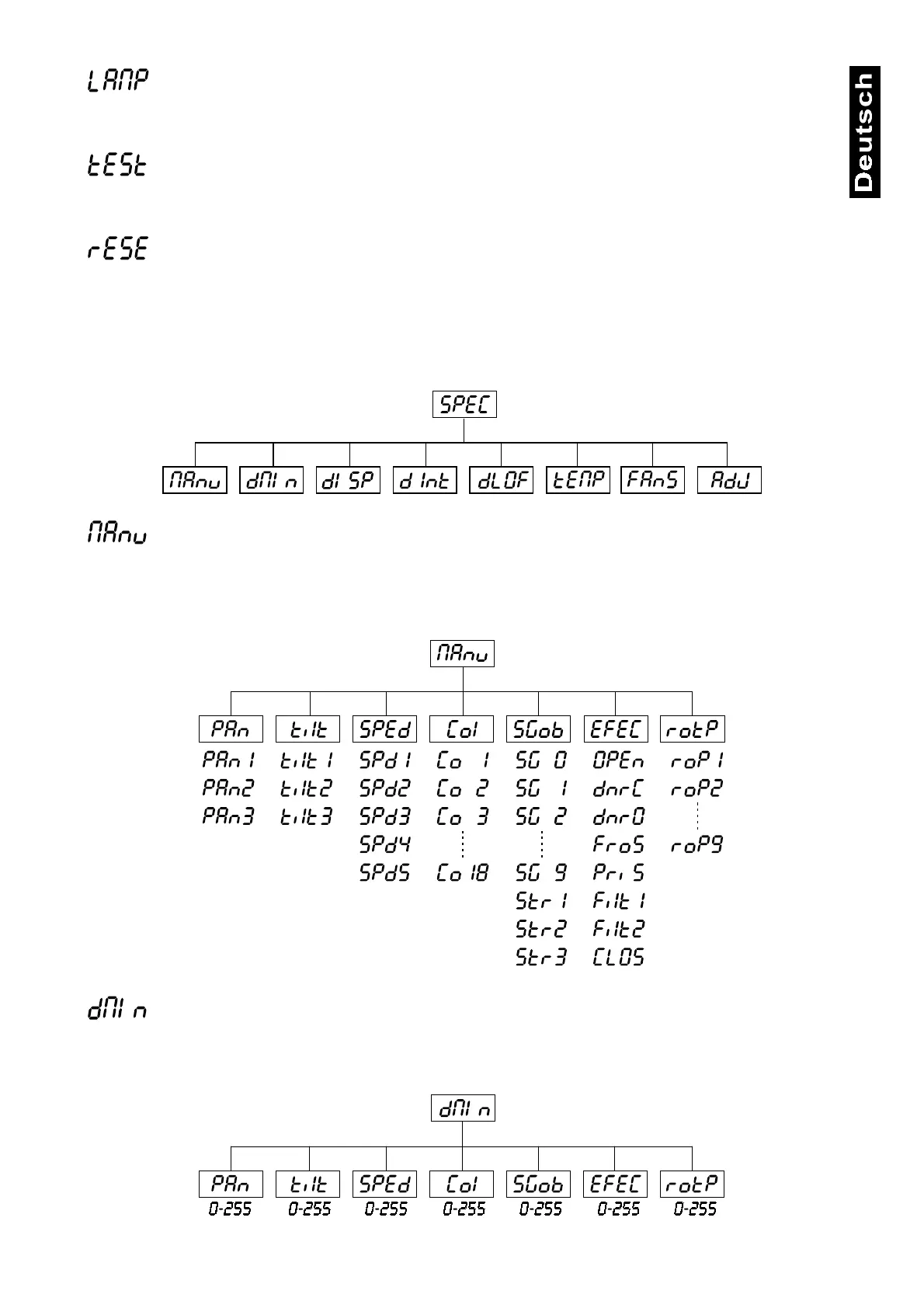 Anzeige der aktuellen DMX-Werte jedes Kanals. Readout DMX values of each channel received by the fixture.