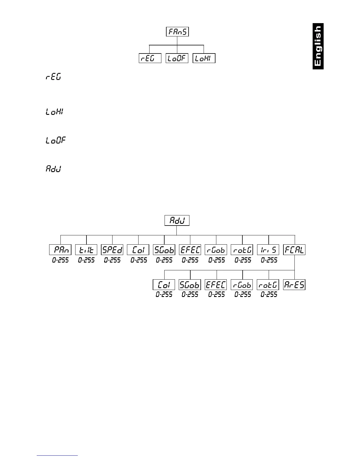 messages: "PAn, Tilt, SPEd, Col, Sgob, EFEC, rGOB, rotG, IriS" by which you can adjust the fixture to the
