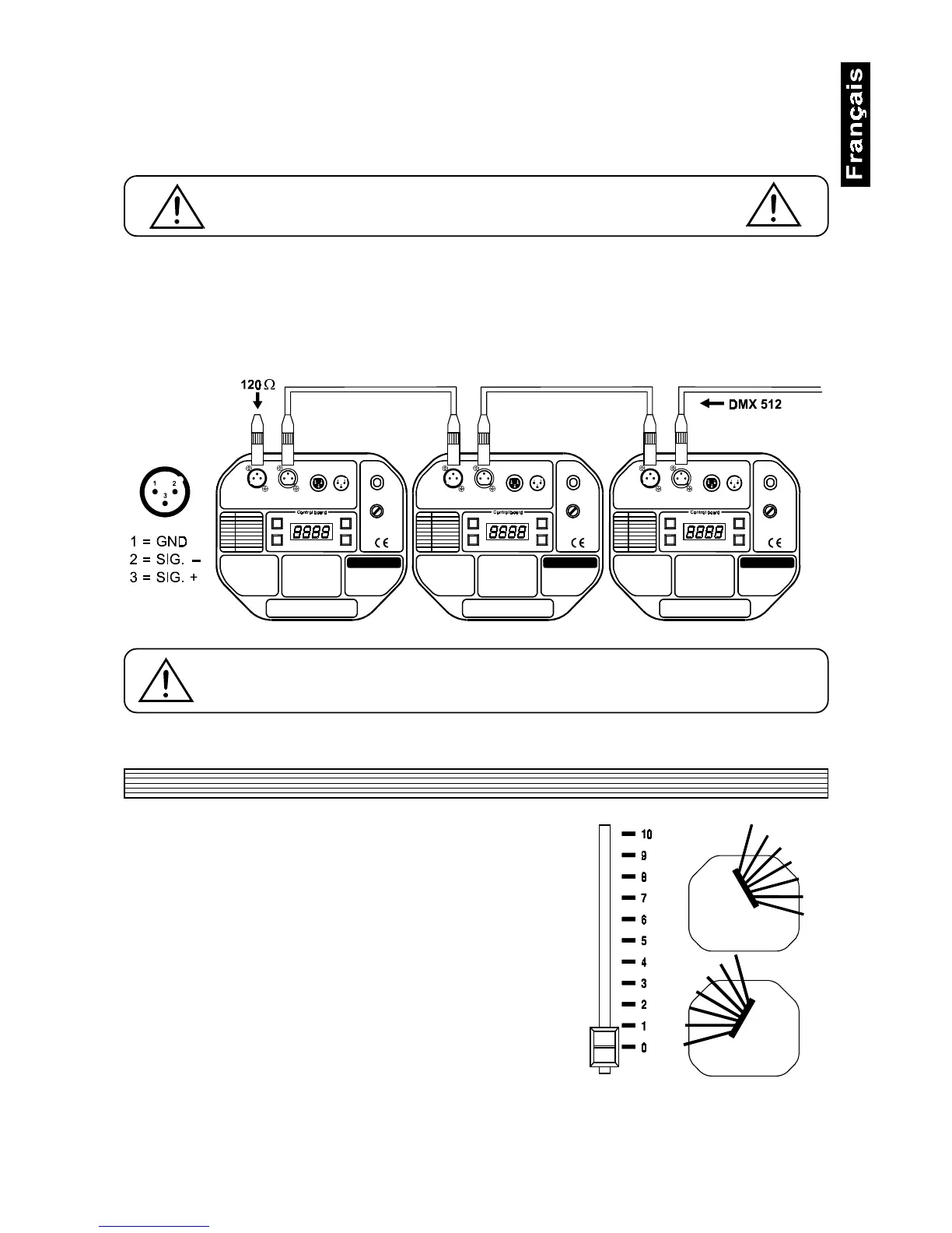 Attention: Au scanner ulterieur, le câble DMX doit être obturé par une résistance de 120W . Braser la résistance
