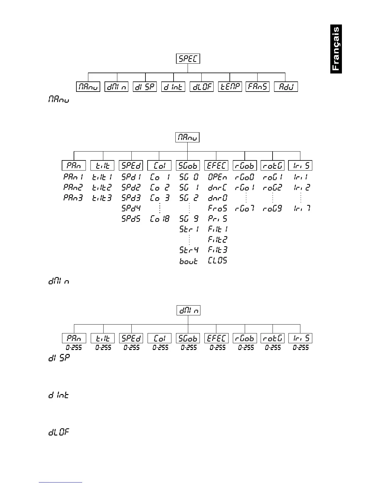 Possibilité de voir tous les valeurs DMX comme reçues du contrôleur. Pressez les touches Up/Down pour