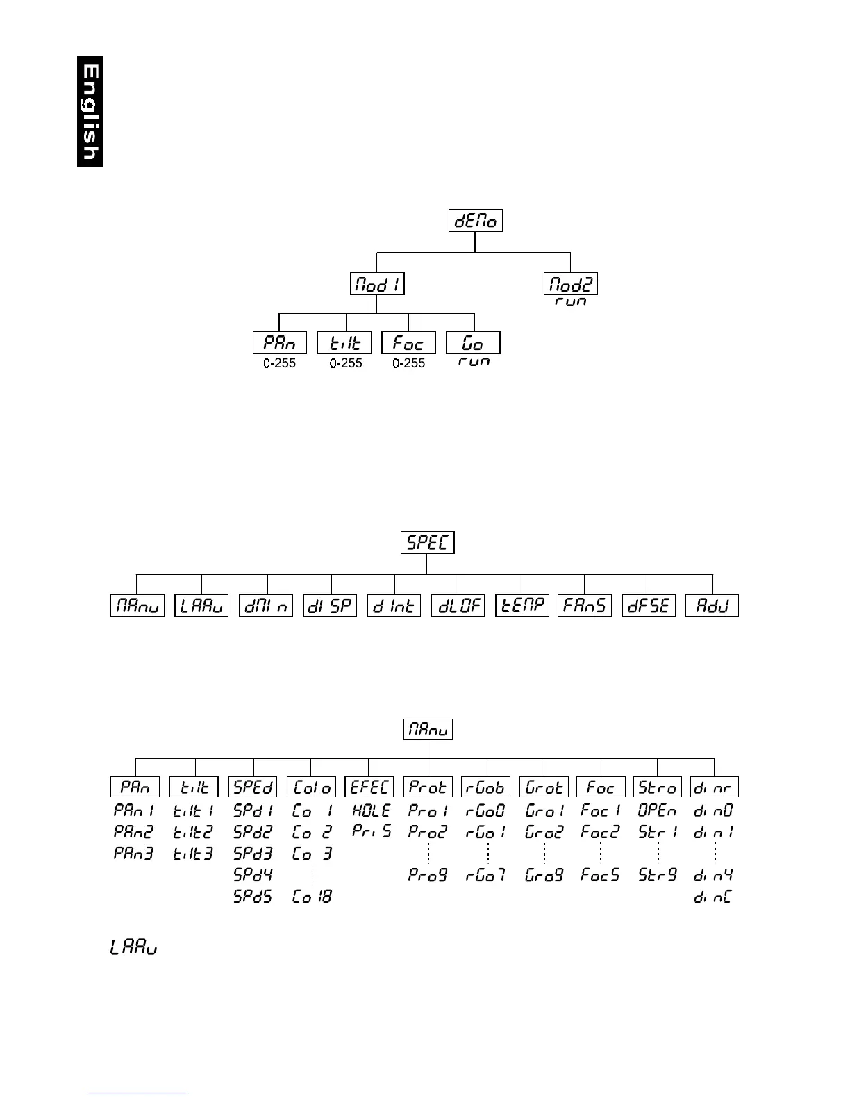 This function allows you to control manually the channel functions of the fixture. Use the [Up] and [Down] keys to