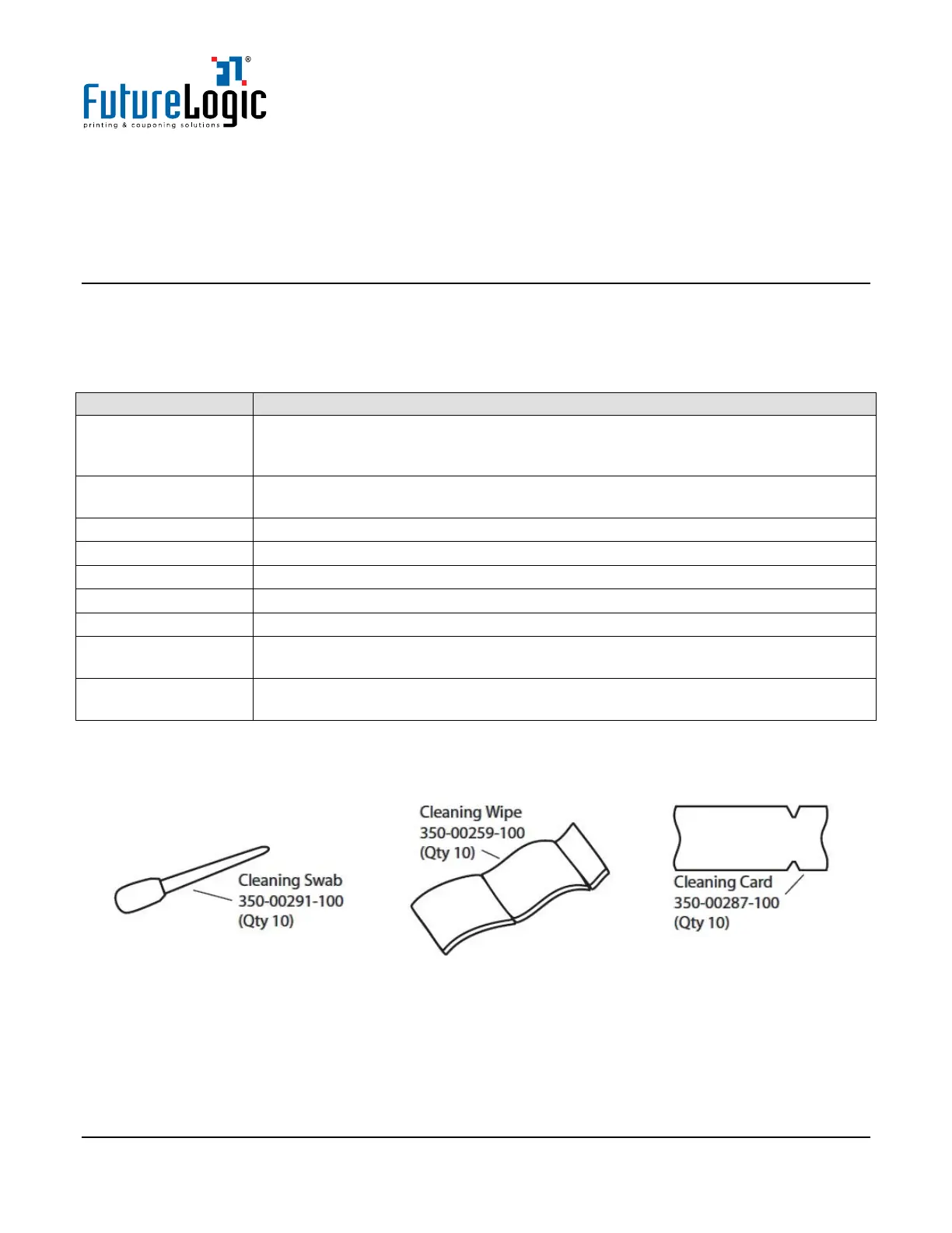 The Printer Cleaning Kit (P/N 350-00292-100) contains 10 each of Cleaning Swab, Cleaning Wipe, and