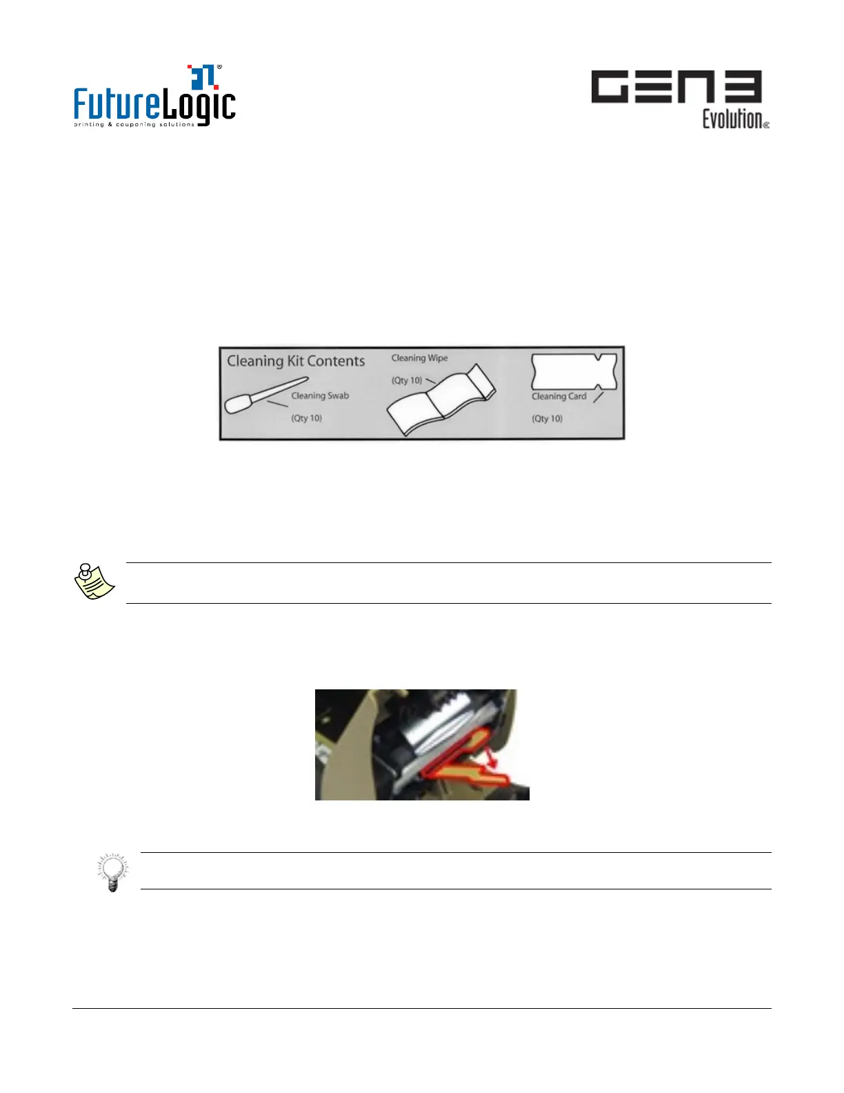 FutureLogic recommends our Cleaning Kits (P/N 350-00292-101) to clean the printer. Each kit includes a