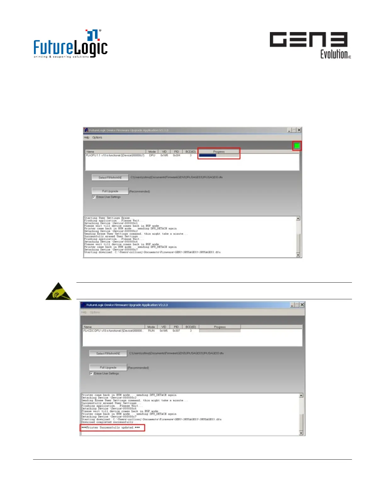 8. Wait for the “Printer Successfully Updated” message to display in the status area.