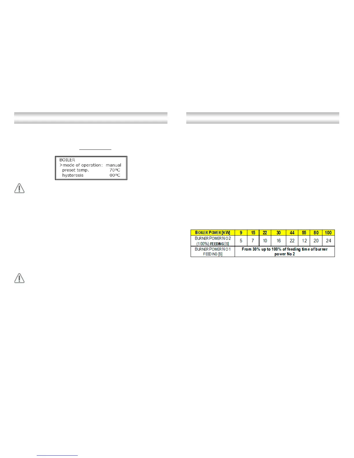 alarms) heating water pump does not start. Temperature of boiler is set manually using parameter