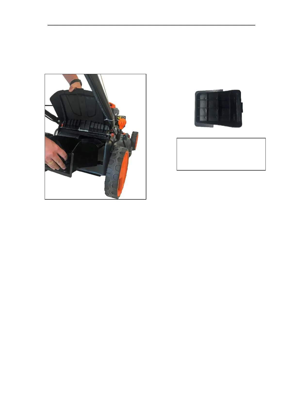 Open and hold rear flap (A), then insert mulch kit (B) into the opening provided. Close rear flap (A) -