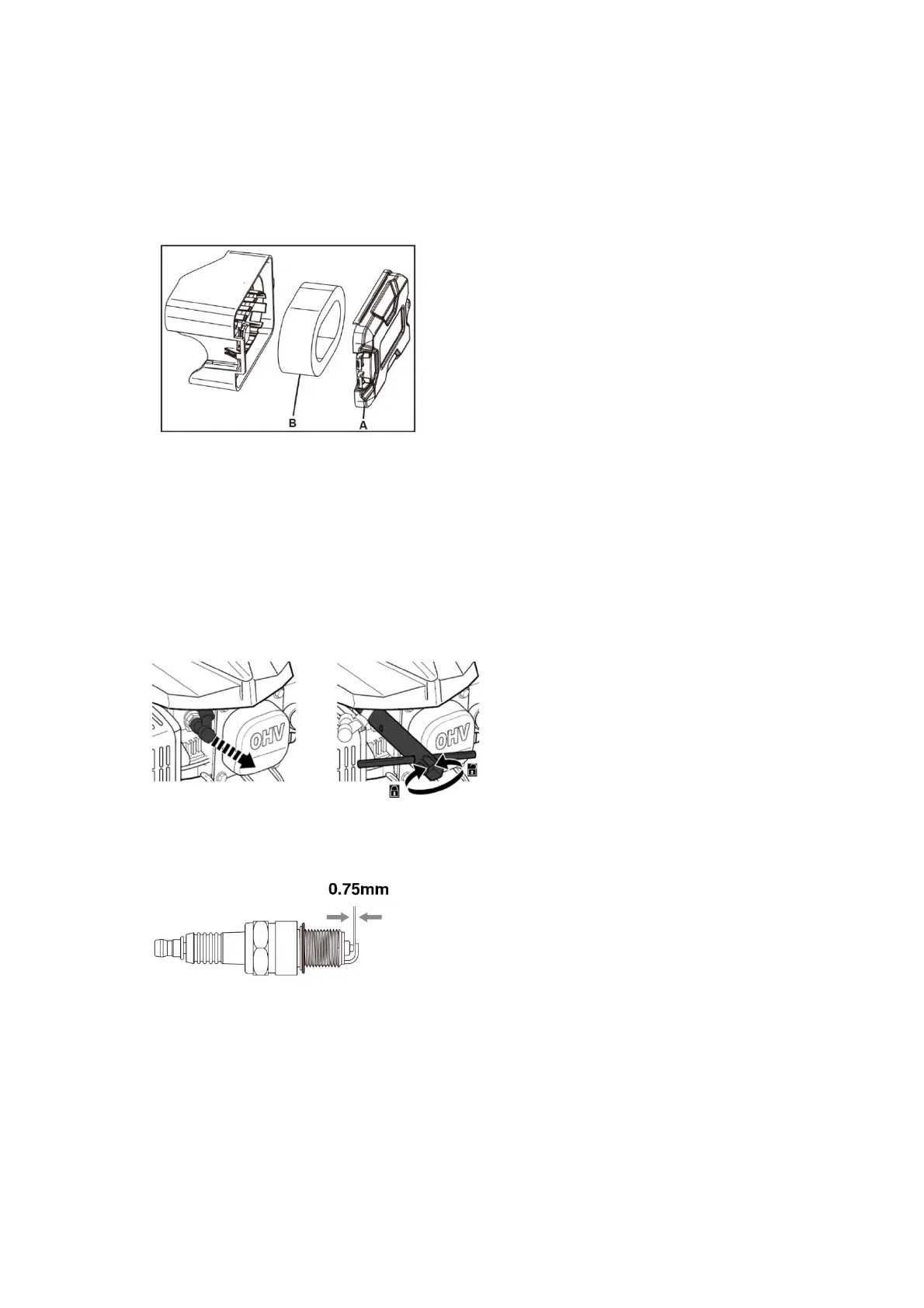 Using a feeler gauge, set the gap to 0.75mm (0.030”). Refit the spark plug (22) taking