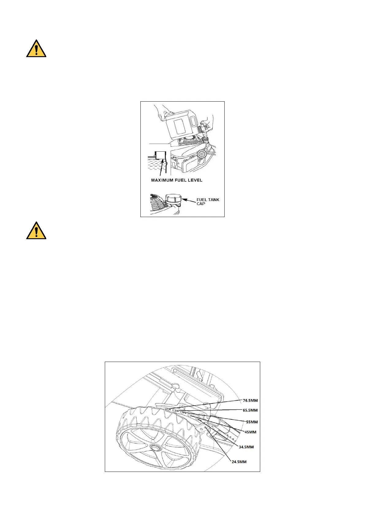 z Add fuel to the bottom of the fuel level limit in the neck of the fuel tank. Do not overfill. Wipe up spilled