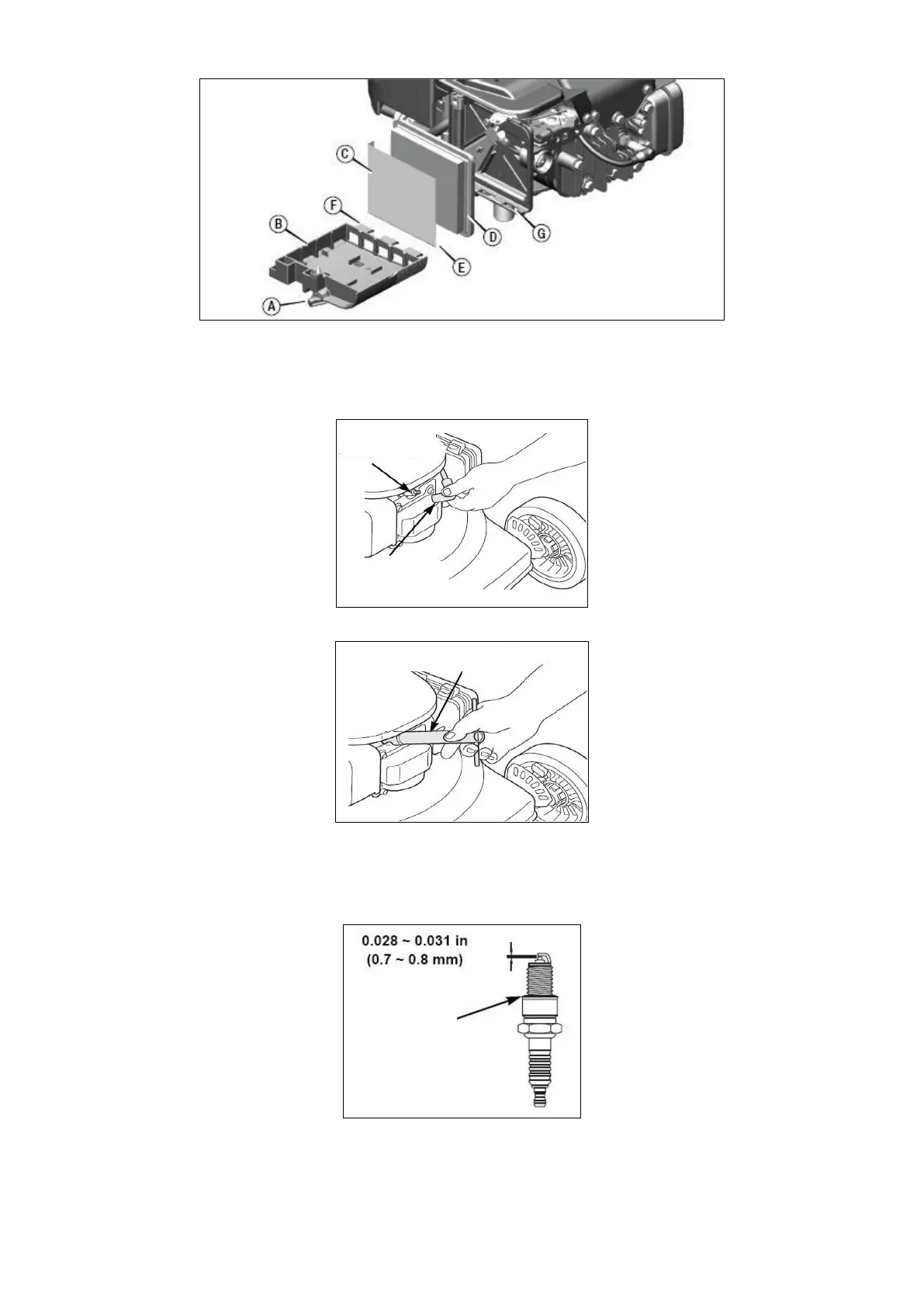 z Mät tändstiftets elektrodavstånd med ett lämpligt mätinstrument. Avståndet bör vara 0,028–0,031 tum
