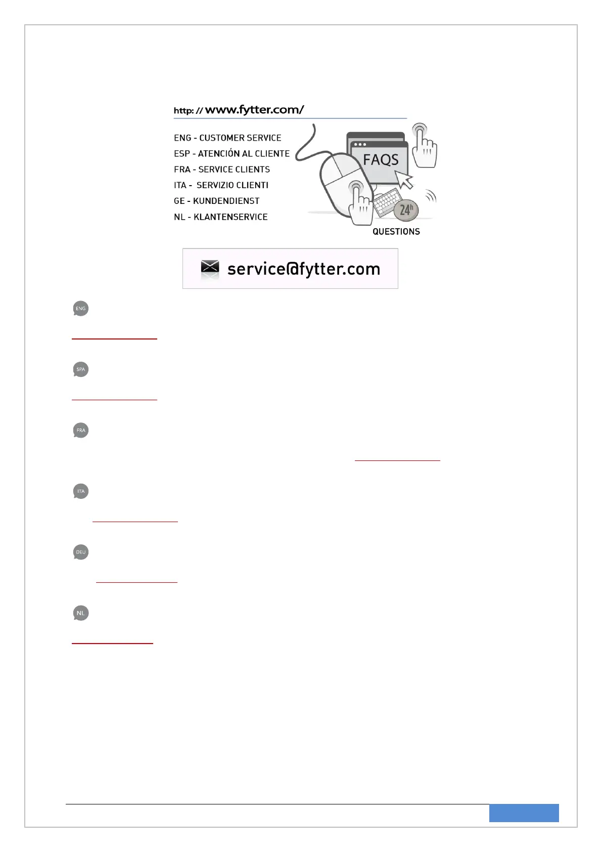 veuillez consulter le site web www.fytter.com, où vous trouverez la section SERVICE CLIENT. Vous pouvez