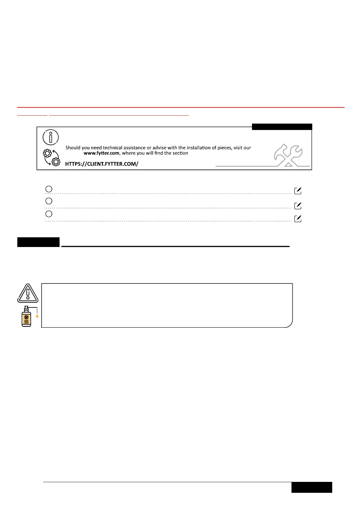 Damage caused by a lack of maintenance (bolts tightening, nuts, lubrication, etc) won't be covered by the guarantee.