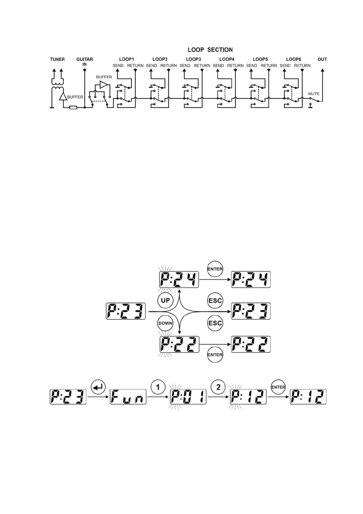 – switched on effects (connected to LOOP1 to LOOP6) and switched on or off buffer,