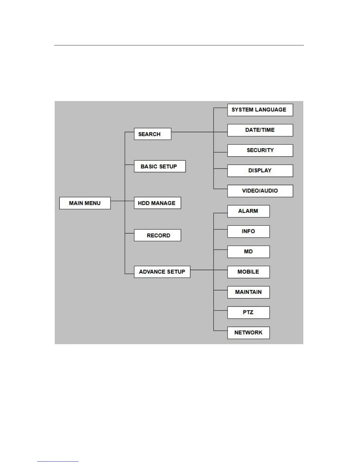 You can control the DVR by a lot of menu operation.This tree will show you the menu
