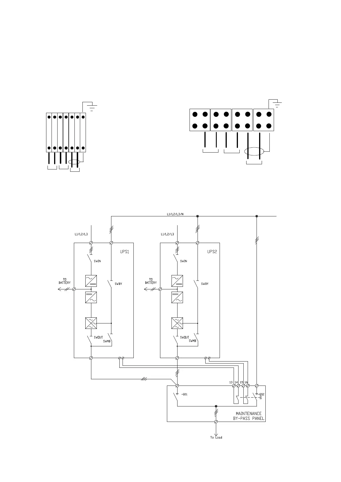 The new disconnector located on the by-pass line (Q2) must be provided with auxiliary contacts (one for each UPS).