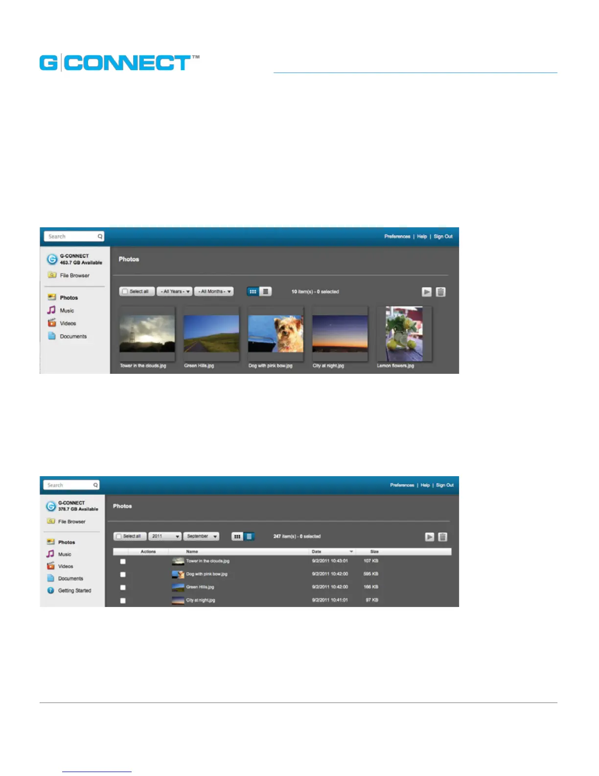 Thumbnail Viewing mode displays small pictorial images of les on G-CONNECT along