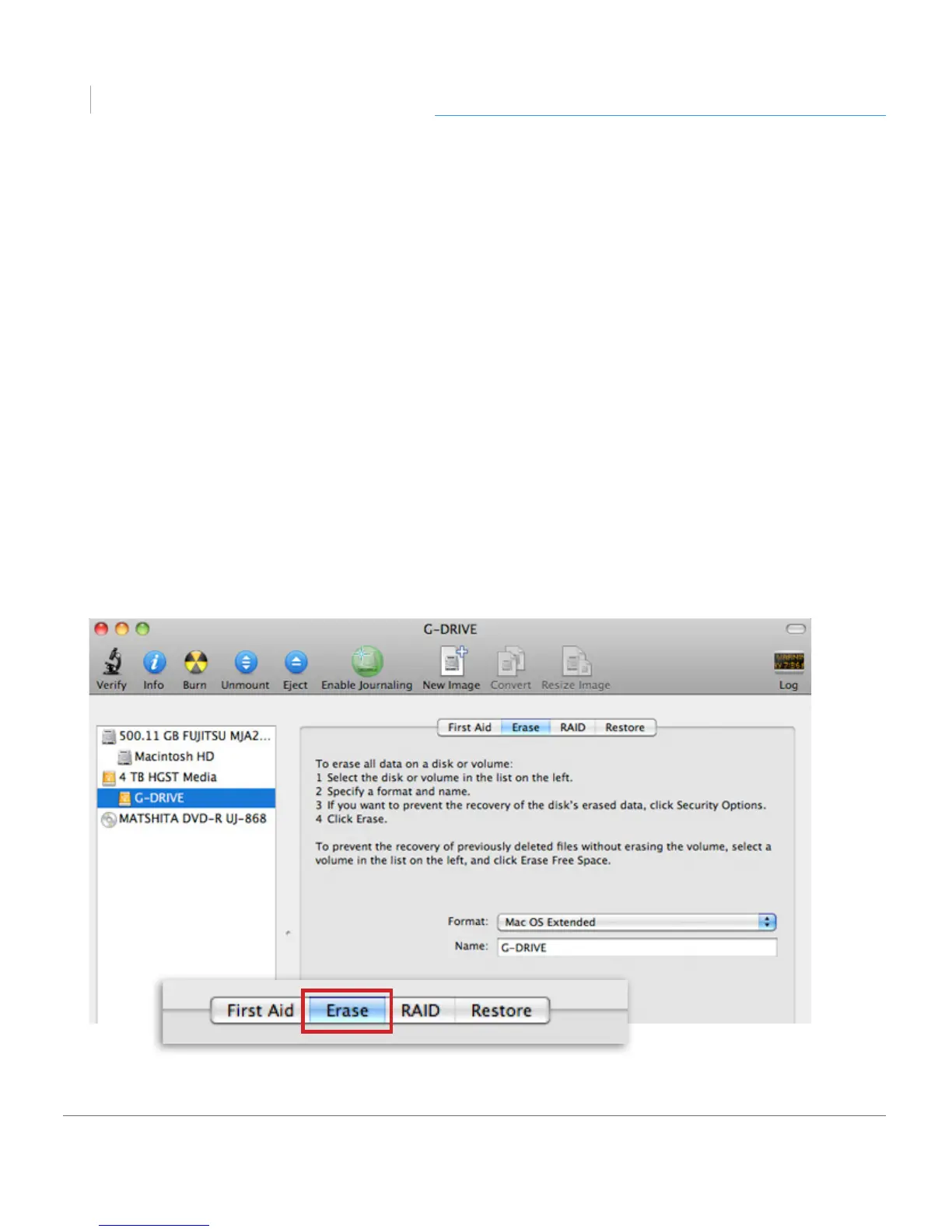 menu is set to the Mac OS Extended (Journaled) option.