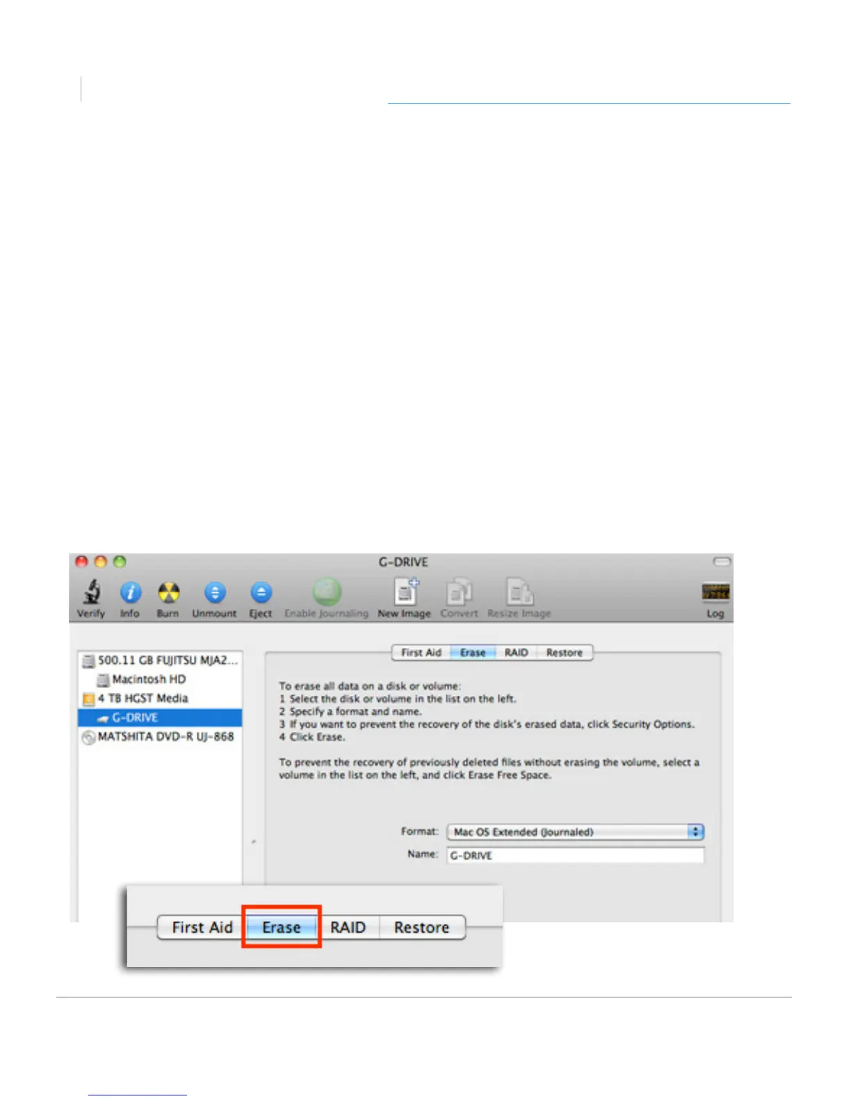 pop-up menu is set to the Mac OS Extended (Journaled) option.