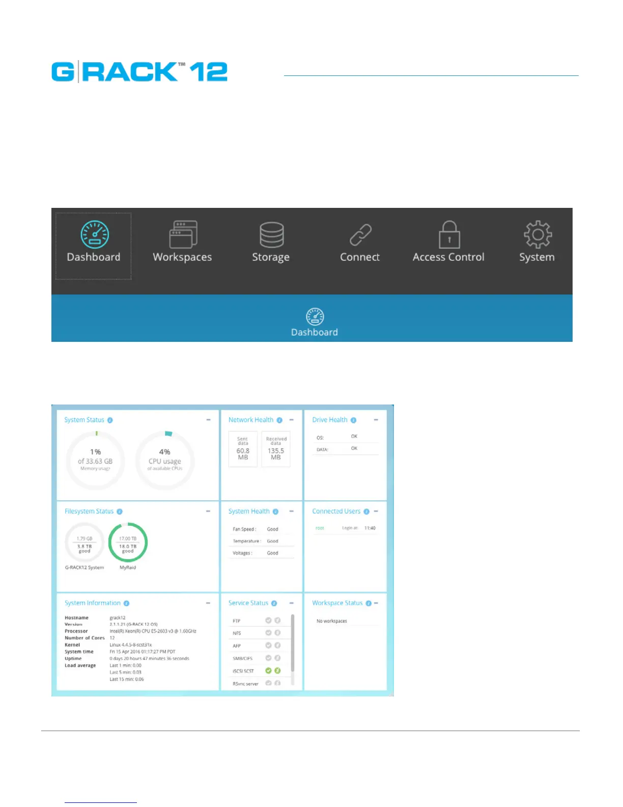 The G-RACK 12 Dashboard provides a quick overview of performance metrics and health statuses