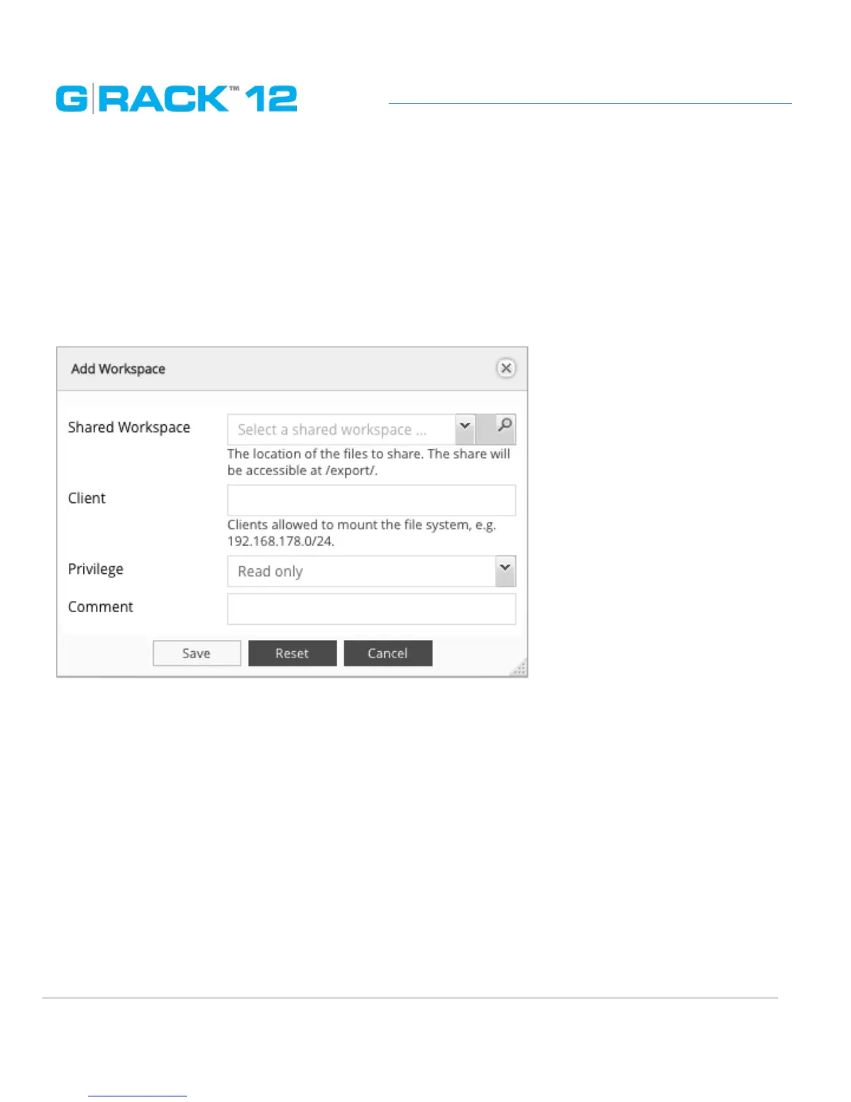 Share is a way a user will connect to the G-RACK 12 to transfer files. We are sharing a workspace.