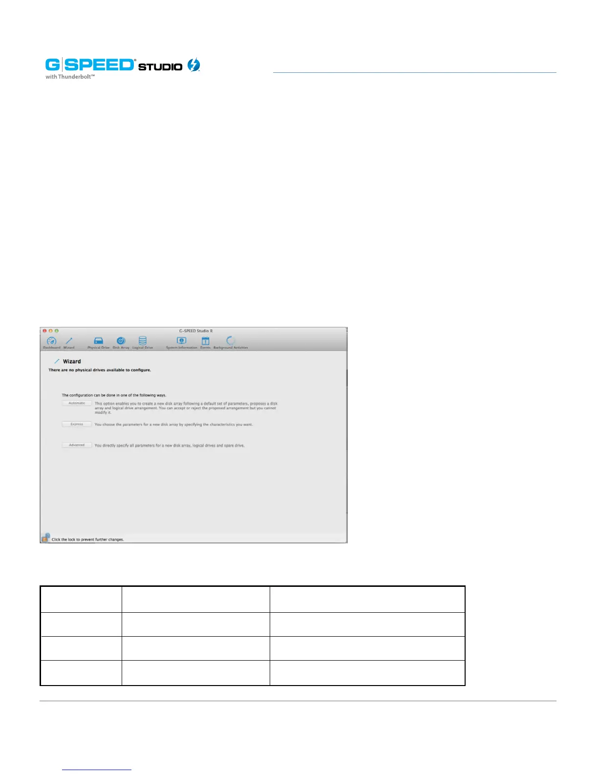 The G-SPEED Studio R Utility includes a Wizard to help you set up a disk array, logical