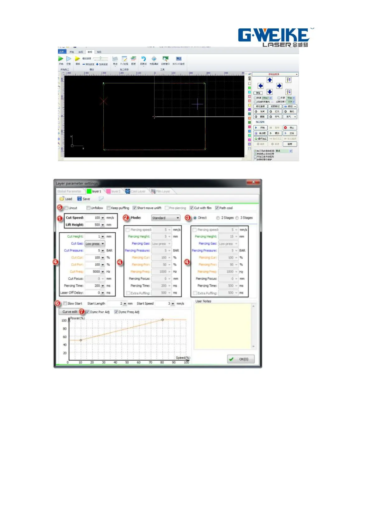 (click on the software right "craft" icon, input parameters); regulation of laser and