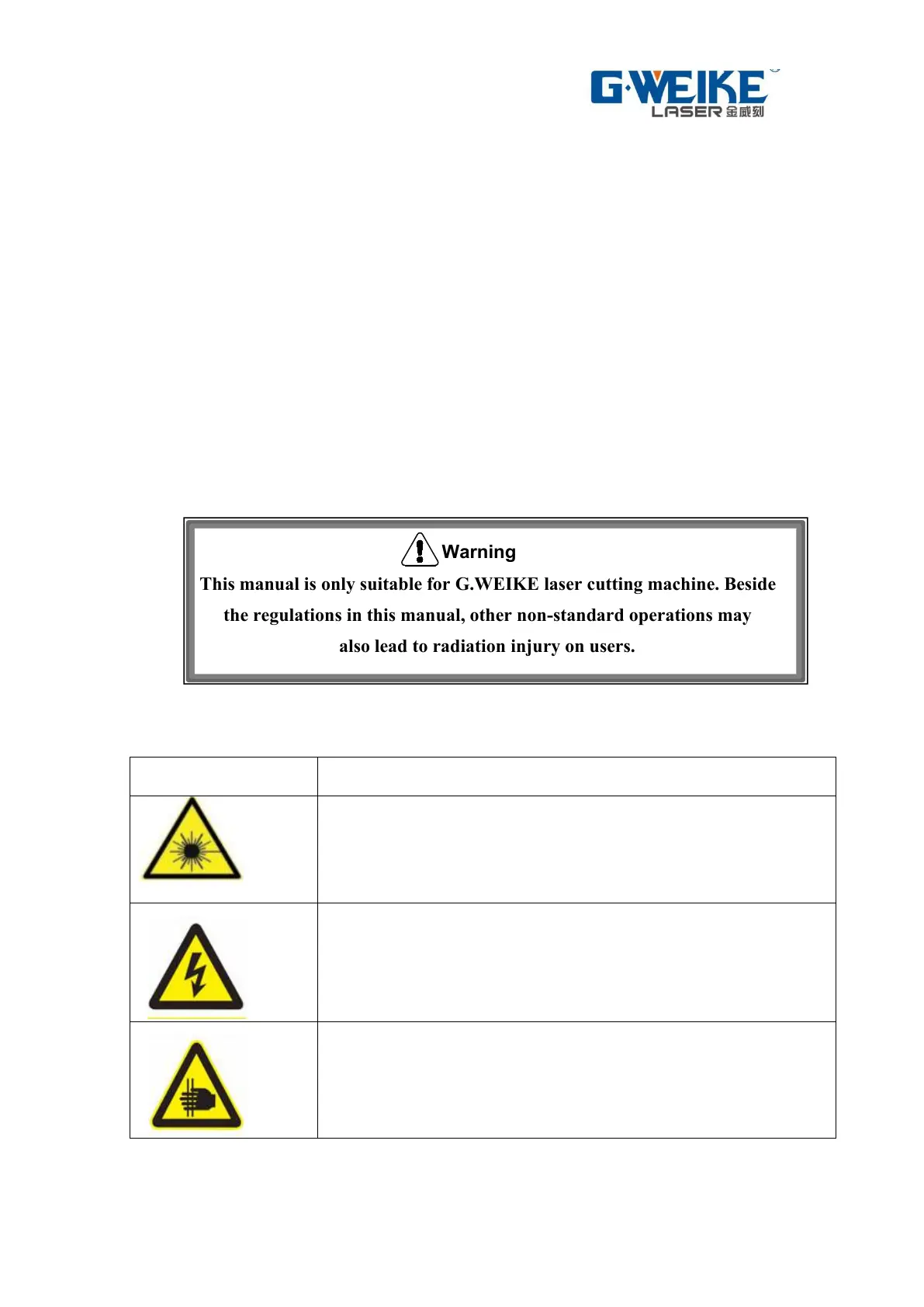 This manual is only suitable for G.WEIKE laser cutting machine. Beside