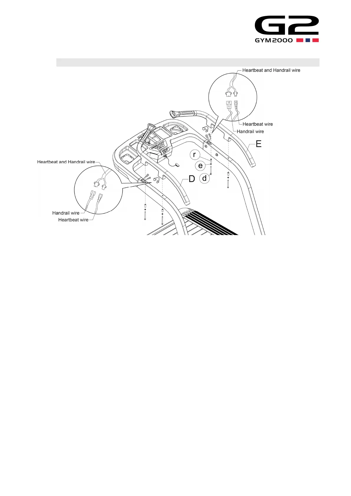 Use screw (d), spring washer (e), Bushing (r) to lock the left and right handrail pipes (D, E) tightly as shown in the figure and fix them