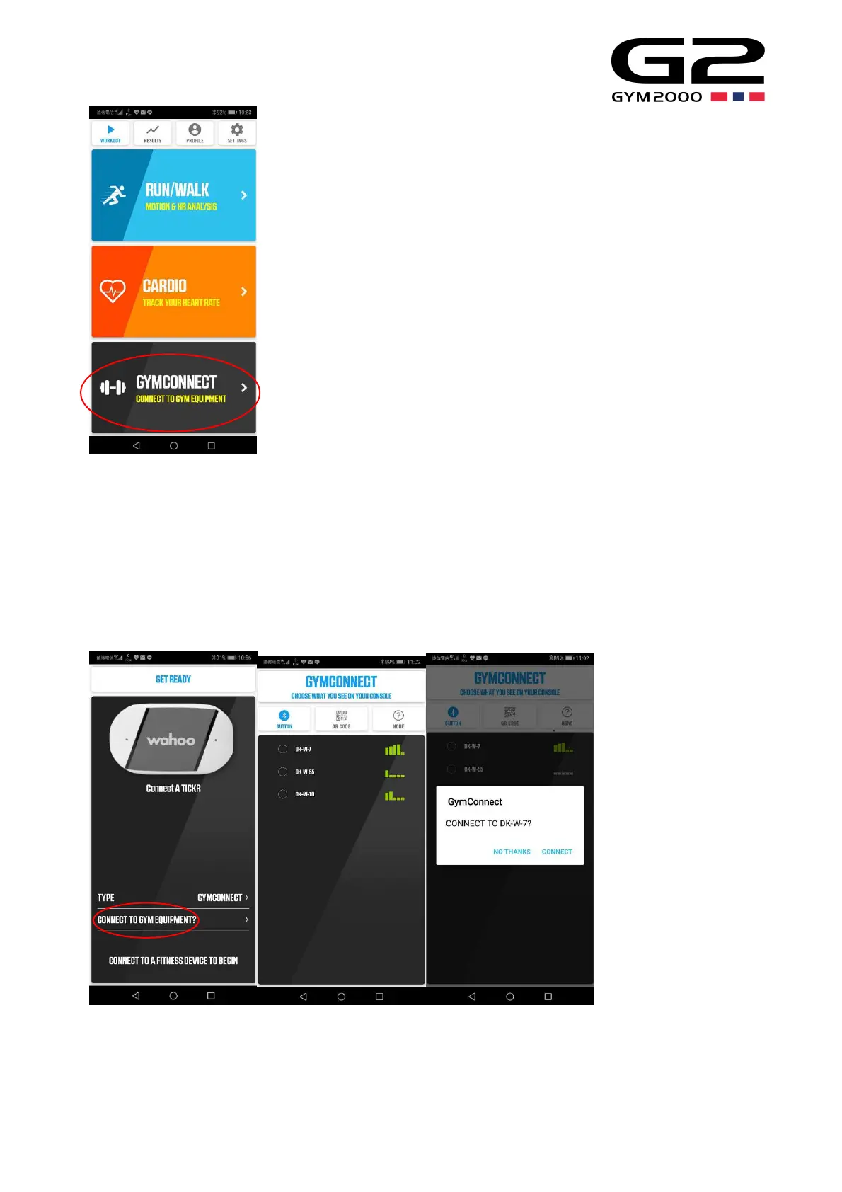 After entering into the connection search page, click CONNECT TO GYM EQUIPMENT? To enter into Bluetooth match page, please