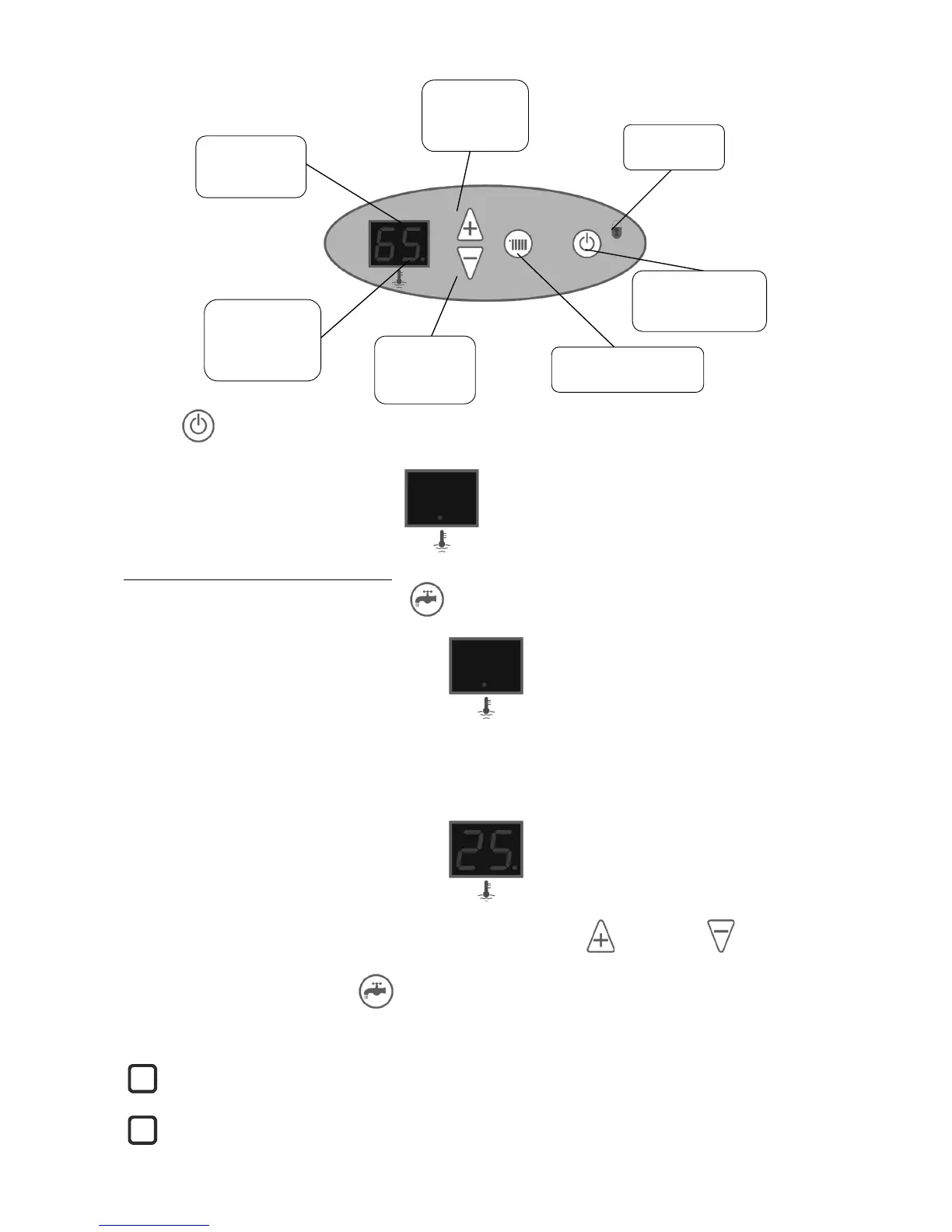 The setting of the DHW temperature can be modified by pushing either the button or the button and using