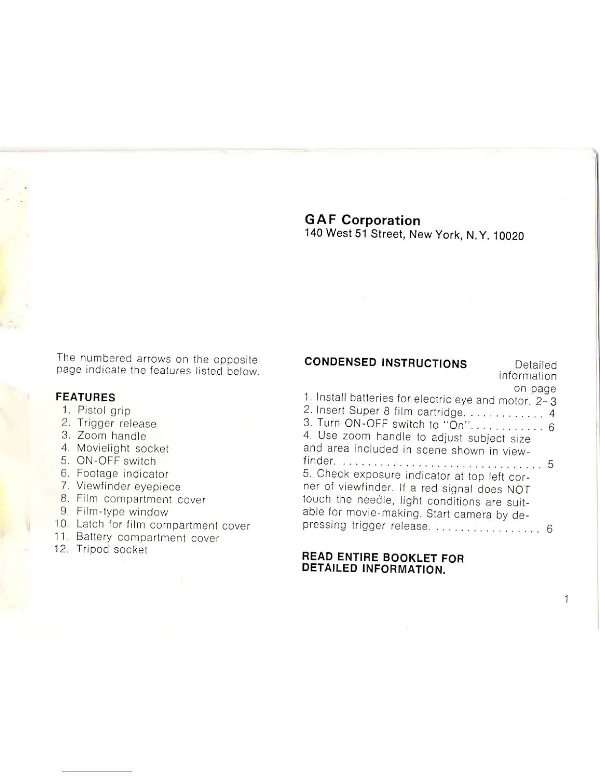 GAF 64R - GAF 64 R Super 8 Movie Camera Overview; Camera Features Identification; Condensed Operation Instructions