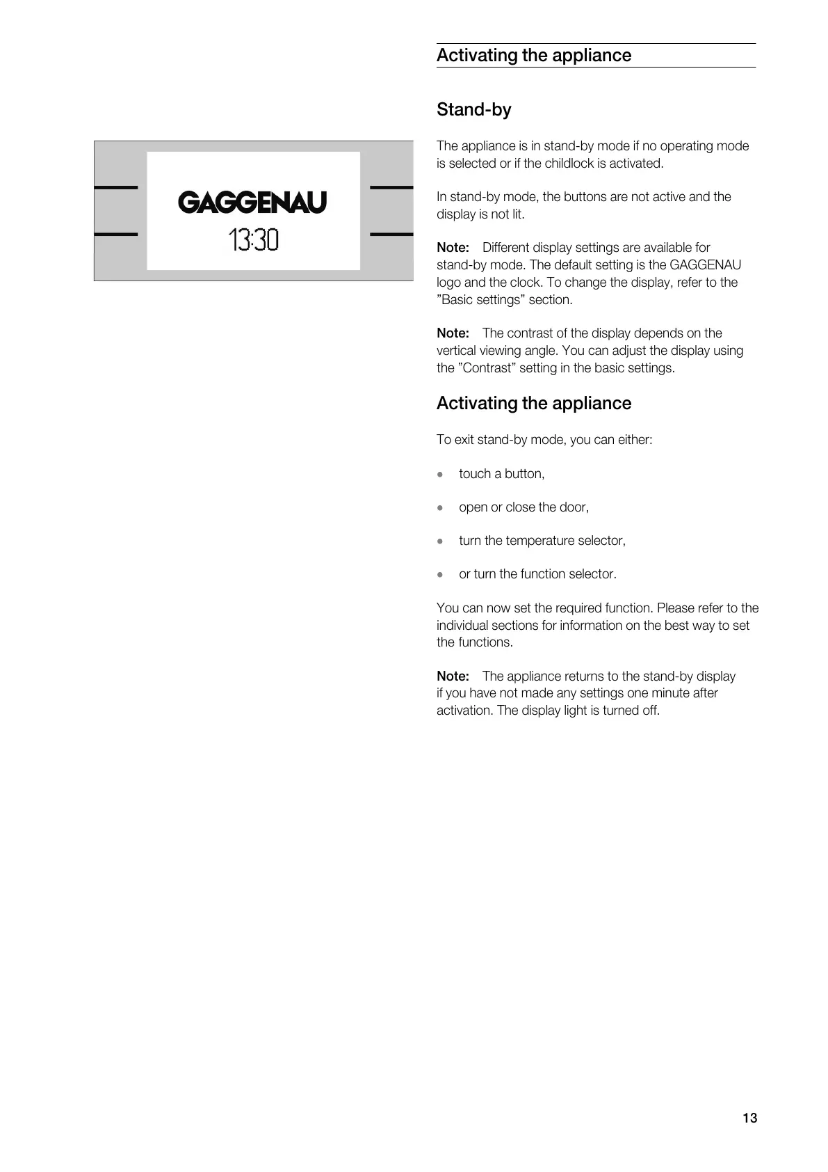 Gaggenau BM 271 - Activating the Appliance; Stand by