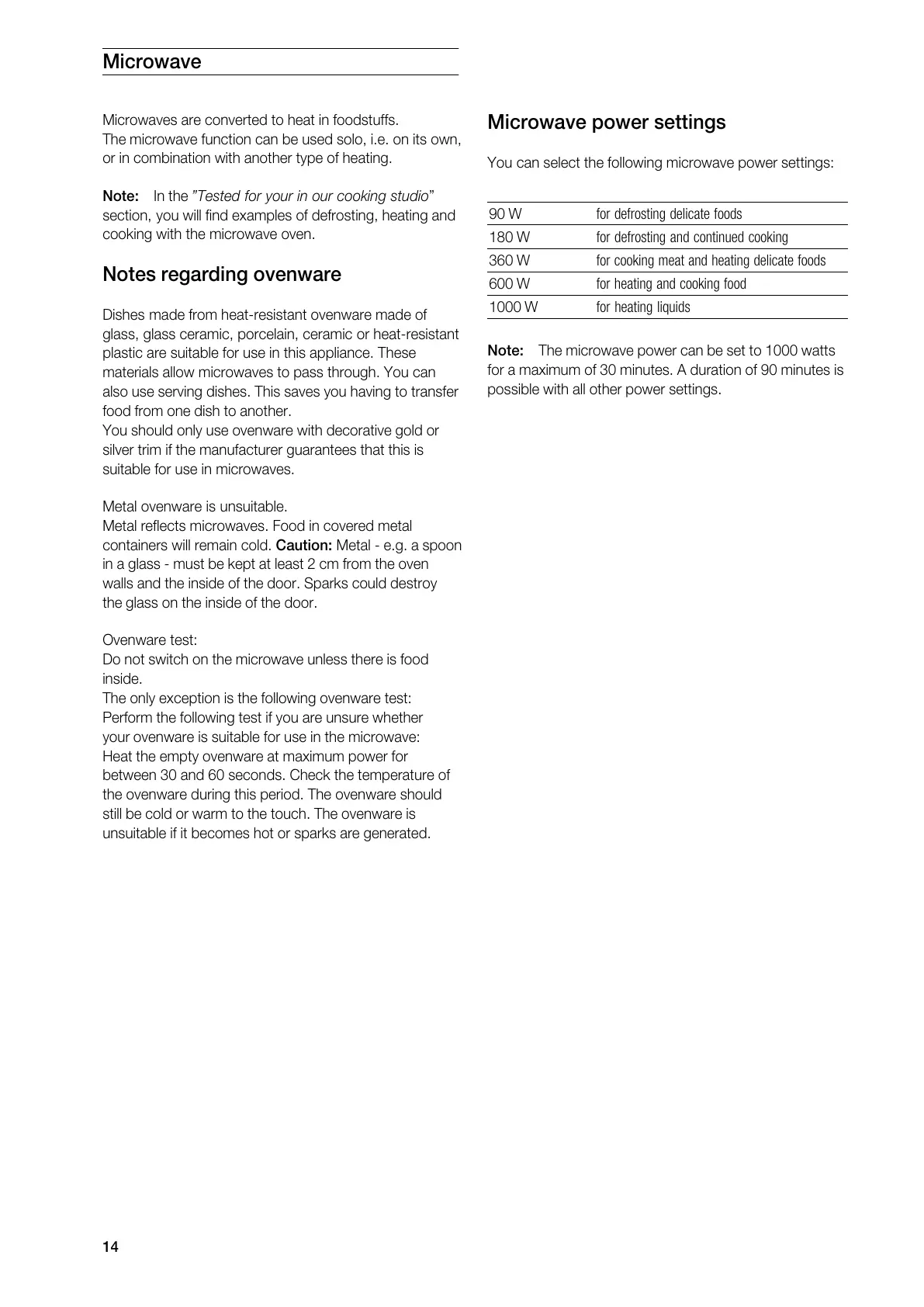 Gaggenau BM 271 - Microwave; Notes Regarding Ovenware; Microwave Power Settings