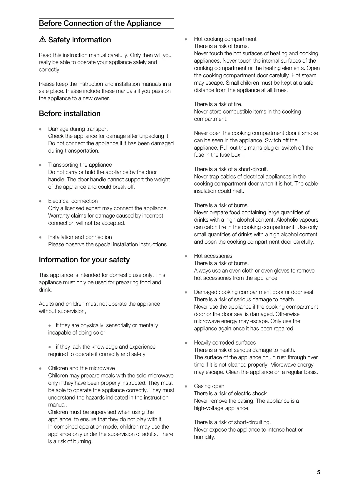 Gaggenau BM 271 - Before Connection of the Appliance; Safety Information; Before Installation; Information for Your Safety