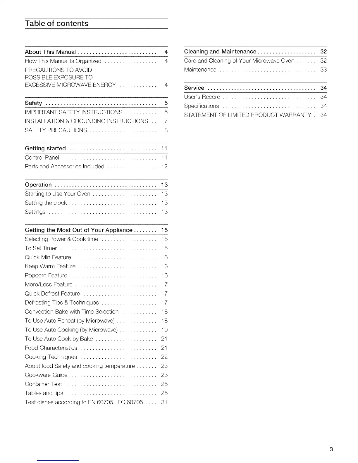 Care and Cleaning of Your Microwave Oven ....... 32