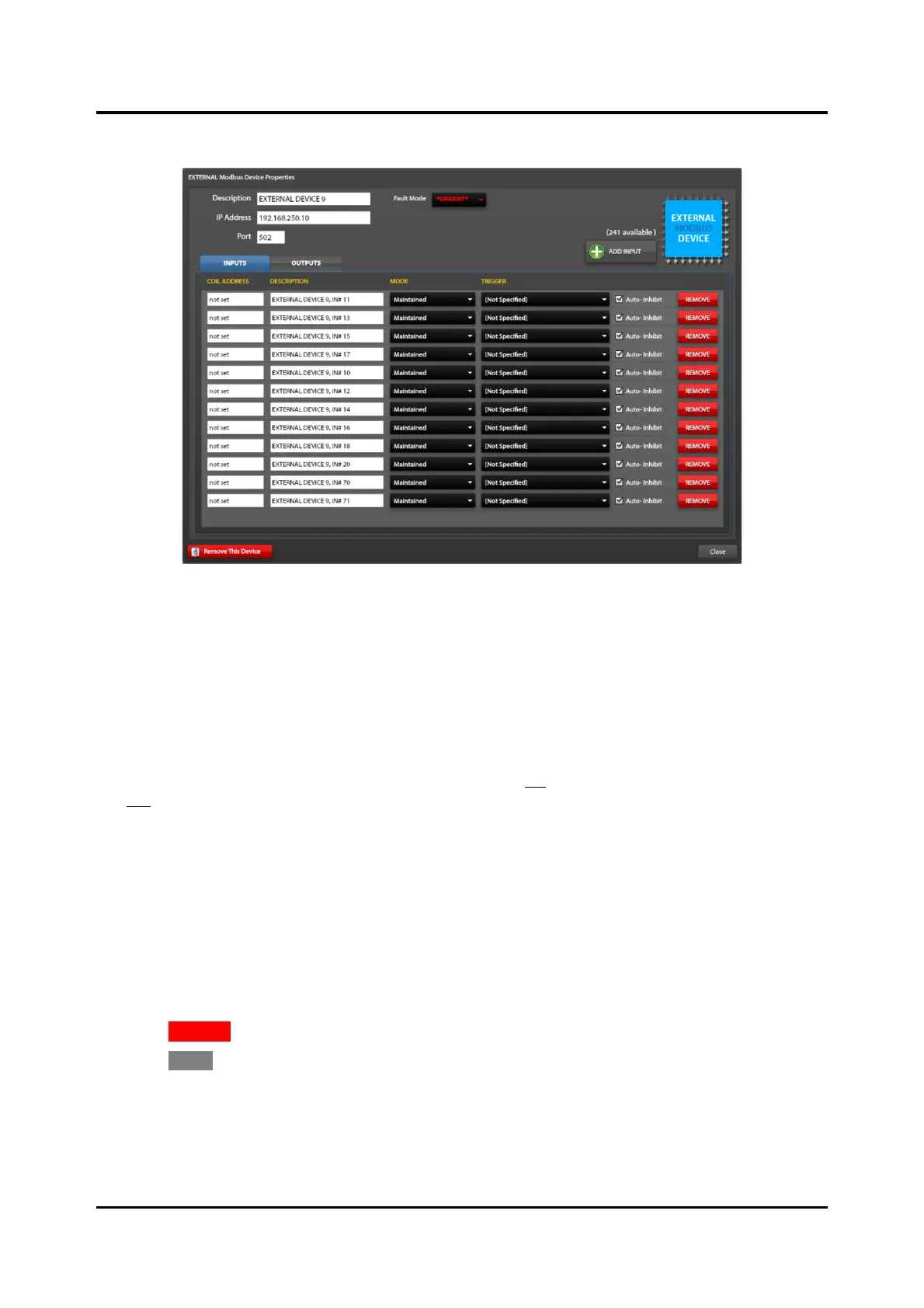 1. Configure the ADDRESS, DESCRIPTION, MODE, TRIGGER, and AUTO-INHIBIT properties for each