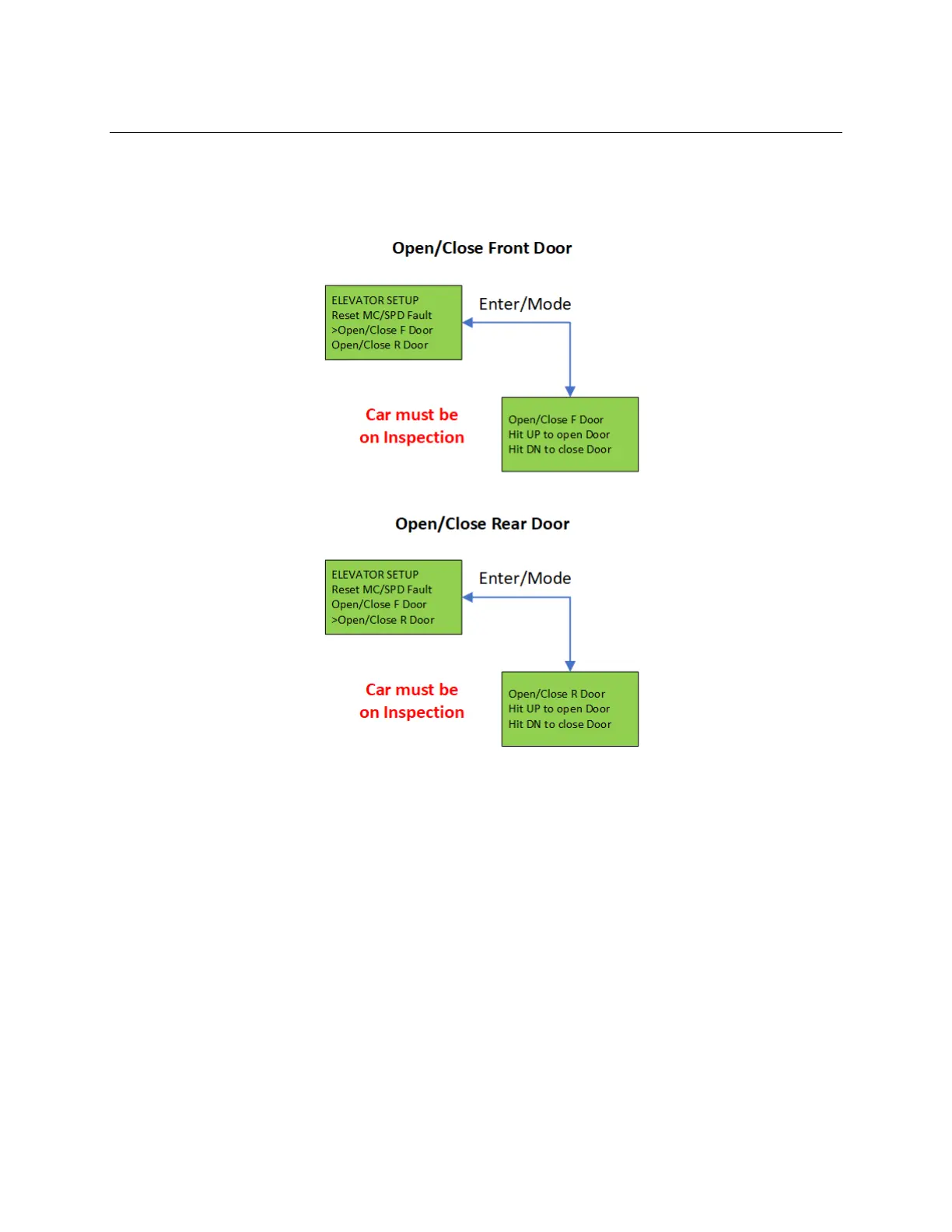 The menu is used to open or close the front or rear door while the car is in a valid door zone and the
