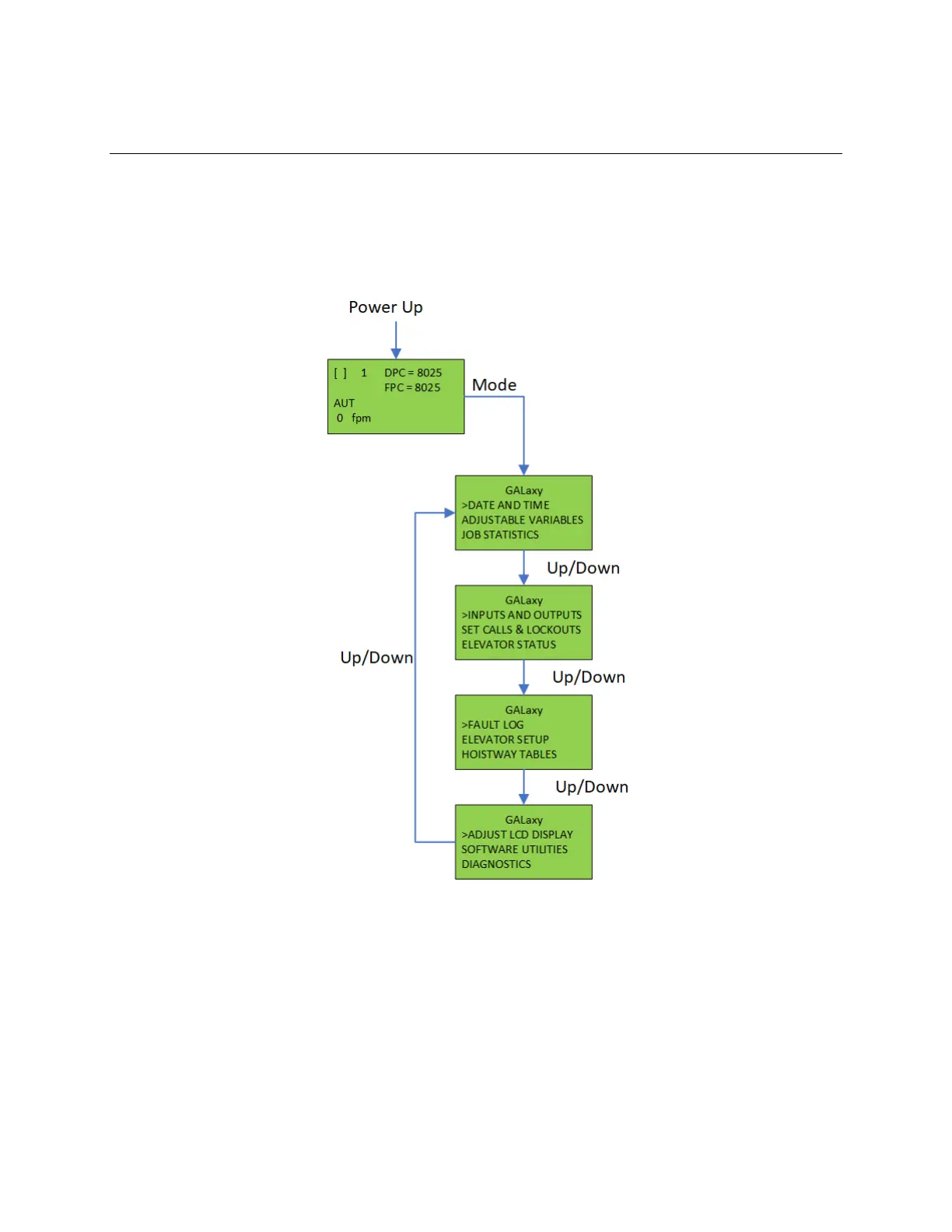 menu from the exiting the Elevator Status Screen, the menu is accessed from the UP, DOWN, MODE
