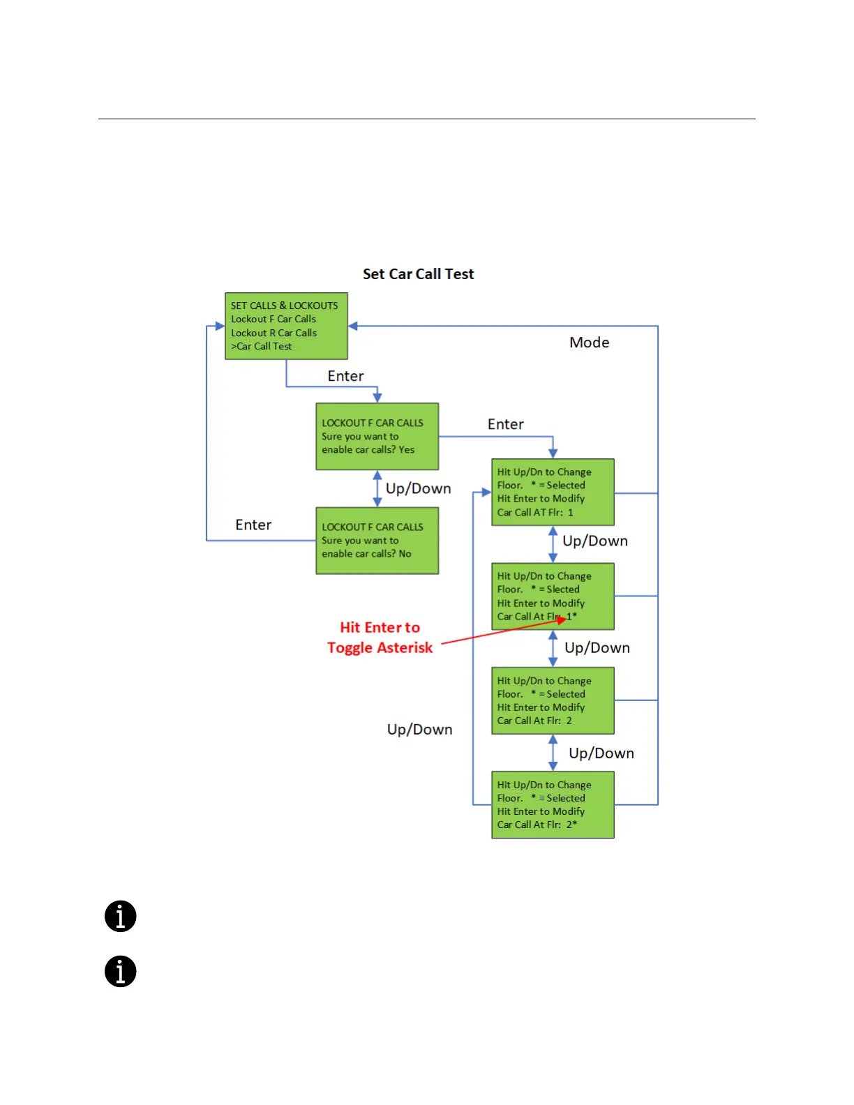 “Car Call Test” can be initiated or discontinued. When performing the “Car Call Test”, the car will