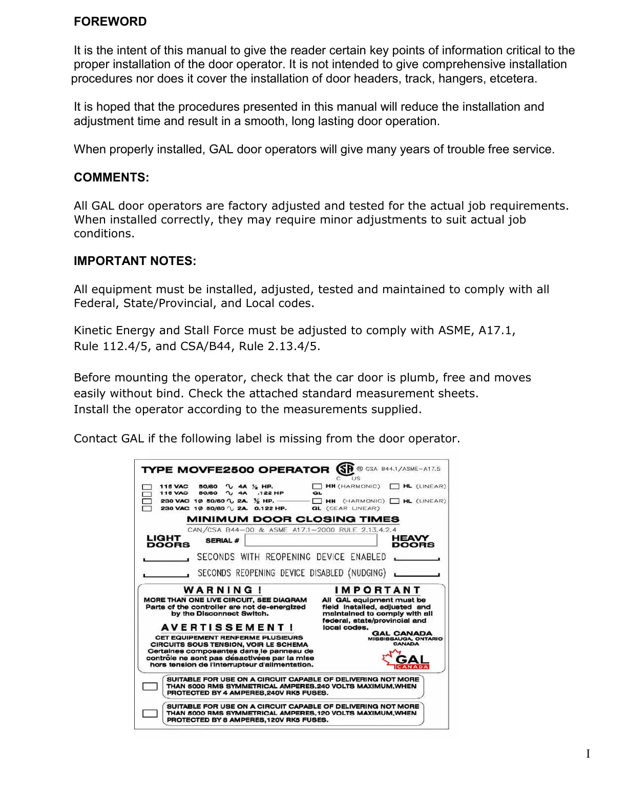 All GAL door operators are factory adjusted and tested for the actual job requirements.
