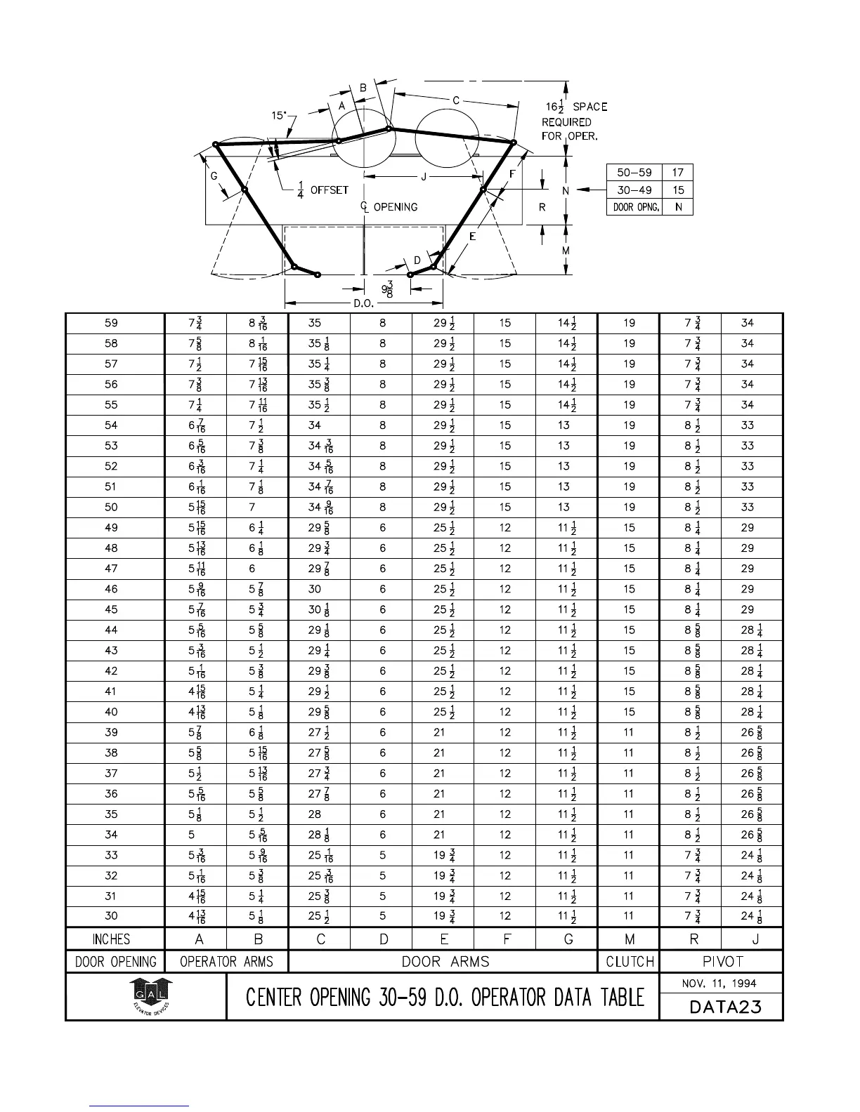 GAL MOVFR - Center Opening 30-59 D.O. Operator Data Table Dwg. DATA 23