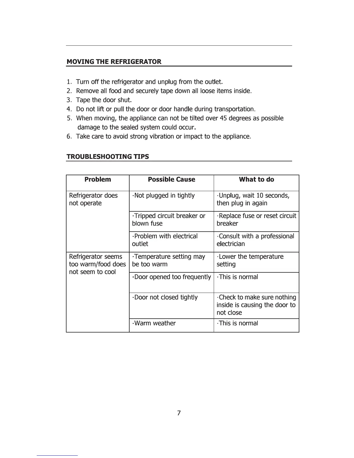 Galanz GL17BK - Moving Your Refrigerator Safely; Refrigerator Troubleshooting Guide