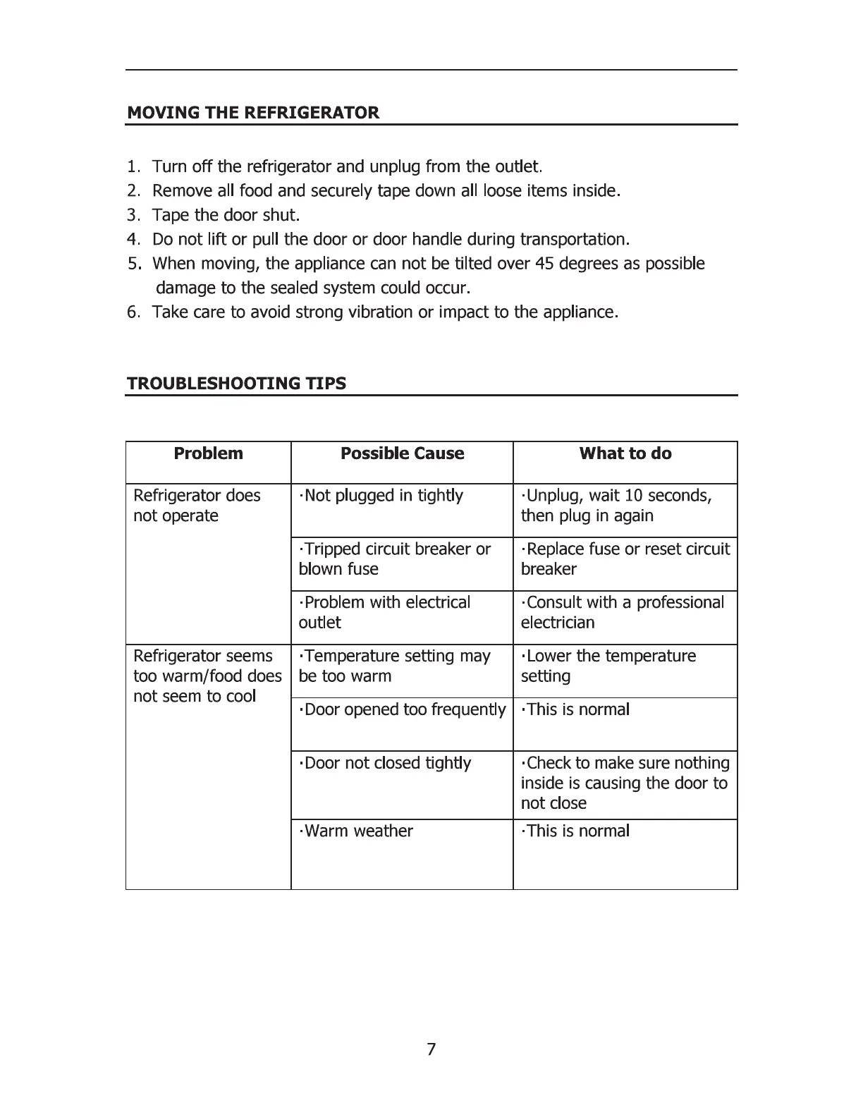 Galanz GL27S5 - Moving the Refrigerator; Troubleshooting Tips