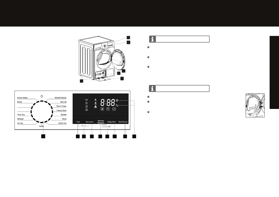 9. Indicator Lights: Drainage container/Fluff filter (Voyants lumineux :