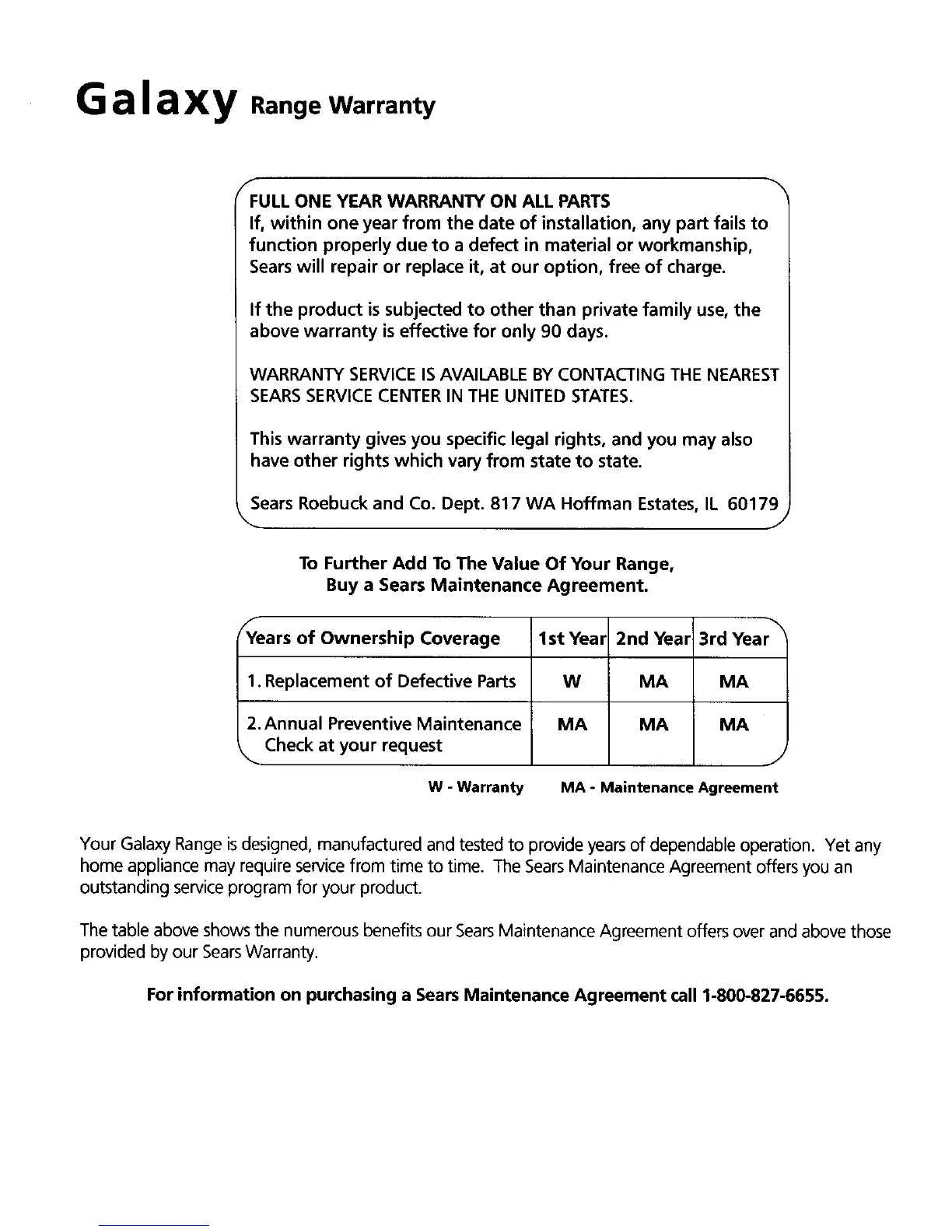 For information on purchasing a Sears Maintenance Agreement call 1-800-827-6655.
